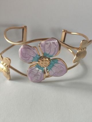 Preciosa pulsera de acero inoxidable dorado con una bonita flor morada y mariposas. Es una pieza elegante y delicada. - Diseño único con flor y mariposas. - Flor 3'5 cm de ancha y 4 de alta - Metal de color dorado. - Flor con detalles en color morado. - Ideal para añadir un toque de estilo a tu look.