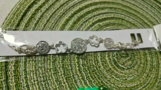 Elegante pulsera con un diseño delicado y moderno. - Acabado plateado brillante. - Detalles de flores y círculos calados. - Cierre de mosquetón seguro.
