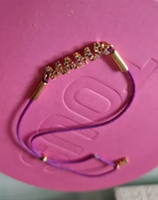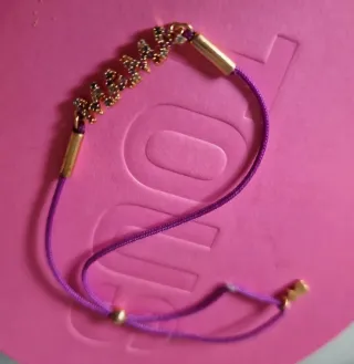 Preciosa pulsera de la marca Tous con la palabra Mama. - Diseño con letras doradas y detalles brillantes. - Cordón ajustable de color lila. - Cierre y detalles metálicos en tono dorado.