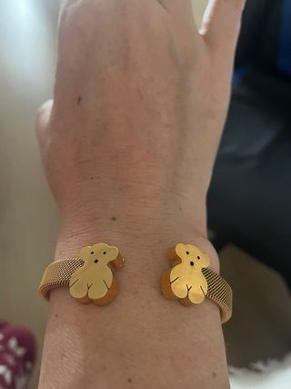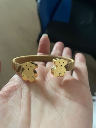 Elegante pulsera con un diseño inspirado en los icónicos ositos. - Acabado dorado brillante. - Diseño abierto tipo brazalete. - Malla metálica en la banda.
