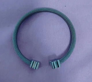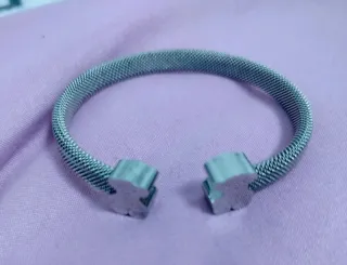 Elegante pulsera imitacion tous con un diseño moderno y llamativo. - Acabado plateado brillante. - Estructura de malla metálica. - Cierre abierto con detalles en los extremos.