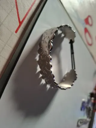 Elegante pulsera de bisutería con un diseño detallado. - Acabado plateado brillante. - Diseño con motivos florales y detalles. - Estilo abierto y ajustable. #Tous #imitación