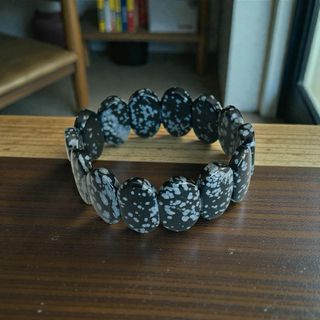 Pulsera elaborada con Obsidiana Nevada natural auténtica, un vidrio volcánico negro con inclusiones grises en forma de copos, totalmente naturales. Cada pieza muestra un dibujo distinto, por eso no hay dos pulseras iguales. Las piezas están pulidas (acabado liso y brillante), montadas en hilo elástico resistente, cómoda para llevar a diario y fácil de poner. Tiene un estilo elegante y potente, ideal para coleccionistas, amantes de minerales o como regalo especial. Medidas y datos: • Mineral: Obsidiana Nevada natural • Diámetro interior: 7 cm aprox. • Tamaño cabujón/pieza: 2,5 cm • Acabado: Liso, pulido ⚠️ Cuidado con falsifica