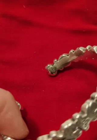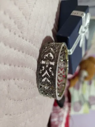 Elegante pulsera plateada con un diseño intrincado y detalles brillantes. - Diseño calado con motivos florales. - Adornada con pequeñas incrustaciones. - Acabado metálico plateado. -No sale colorr y es una piecees como Antiguas