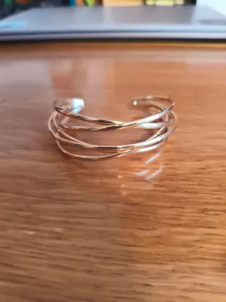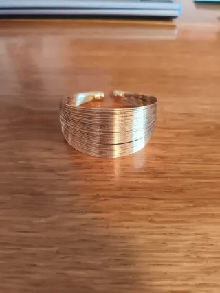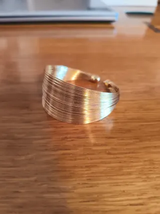 Elegante pulsera dorada con un diseño de múltiples alambres entrelazados. - Acabado brillante. - Estilo abierto ajustable.