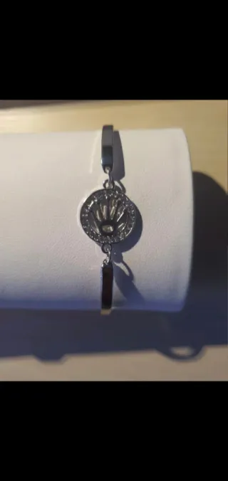 Elegante pulsera con un diseño inspirado en la marca. - Acabado en plata brillante. - Detalle de circonitas alrededor del logo. - Cierre seguro y discreto.