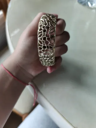 Elegante pulsera tipo bangle adornada con brillantes cristales. - Diseño intrincado con detalles florales. - Acabado metálico en tono dorado y plateado.