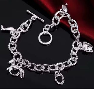 Elegante pulsera de plata con temática ecuestre. - Diseño con charms de caballos, herradura y un elemento de equitación. - Cadena con eslabones entrelazados y cierre de mosquetón. - Acabado brillante.
