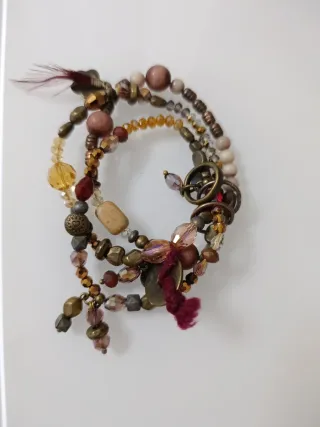 Conjunto de pulseras con un diseño brillante y adornos. - Variedad de cuentas y abalorios. - Cierre de estilo toggle. - Incluye plumas y detalles metálicos.