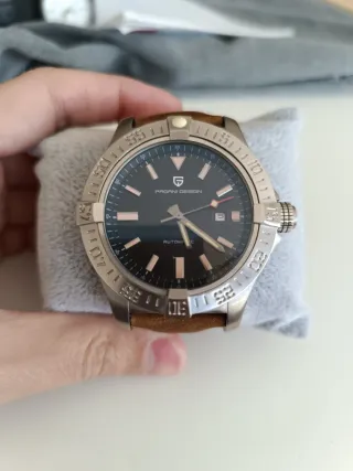 Reloj de pulsera con diseño moderno y elegante. Reloj homenaje a la marca Breitling. Tiene un movimiento automático japonés. La caja mide 48 mm de ancho y 54'3 hasta la corona, con un ancho de asa de 23,5 mm. Tiene 15 mm de grosor. Tiene un punto luminoso increíblemente brillante, una esfera y un diseño elegantes. Correa de cuero auténtico con hebilla firmada. La correa está algo señalada por el uso, aunque ha sido poco. Se muestra en las fotos. El motivo de su venta es que es muy grande para mí muñeca. - Esfera de color negro. - Correa de cuero marrón. - Caja de acero plateado.