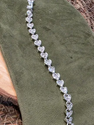 Elegante pulsera con un diseño de corazones adornados con pedrería. - Diseño de corazones. - Detalles con pedrería brillante. - Acabado plateado.