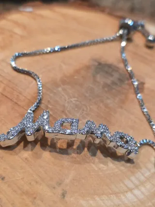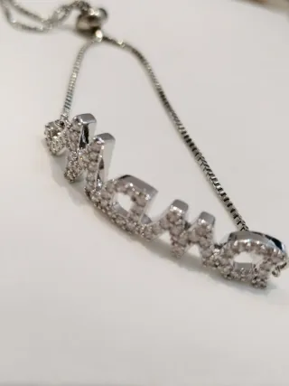 Elegante pulsera con el nombre 'Mama' adornado con brillantes. Su diseño ajustable la hace cómoda para cualquier muñeca. - Nombre 'Mama' con incrustaciones. - Cadena ajustable.