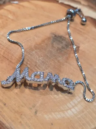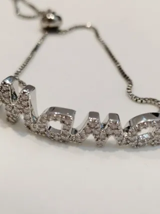 Elegante pulsera con la palabra Mamá en letras brillantes, perfecta para regalar. - Diseño ajustable para mayor comodidad. - Acabado plateado brillante.