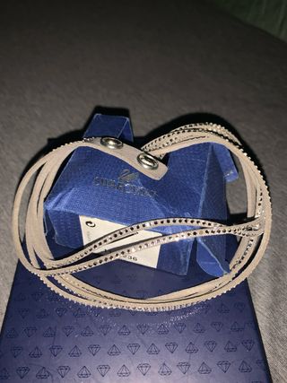 Elegante pulsera de la marca Swaroskicon un diseño delicado y brillante. - Acabado en gamuza beige. - Detalles con cristales plateados. - Cierre con dos botones a presión.