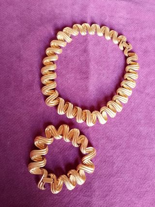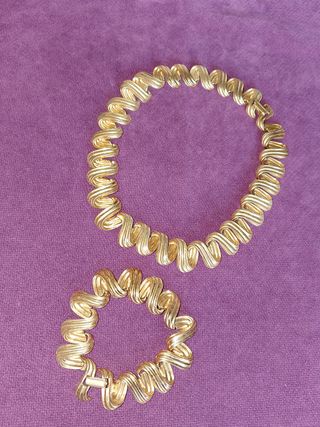 Conjunto de collar y pulsera con un diseño único en espiral. - Acabado dorado brillante. - Diseño en espiral. - Cierre seguro.