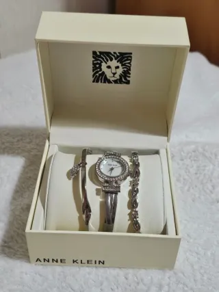 Elegante conjunto de joyería de Anne Klein. - Incluye un reloj con esfera blanca y detalles brillantes. - Dos pulseras a juego, una con un charm. - Acabado plateado. Los desperfectos se pueden ver en las últimas 3 fotos.
