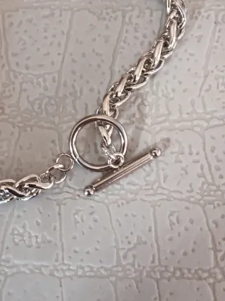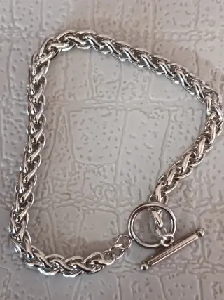 Elegante pulsera con un diseño de cadena trenzada. - Acabado plateado brillante. - Cierre de mosquetón seguro. - Estilo moderno y versátil.