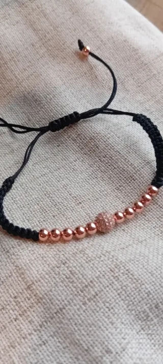Pulsera con cordón negro ajustable y detalles en dorado rose. Nueva a estrenar Unisex - Cuentas metálicas doradas rose. - Detalle central con cuentas brillantes. - Cierre de cordón trenzado.