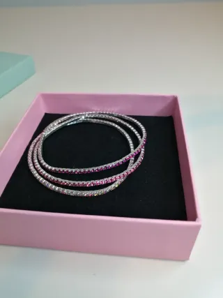 Elegante brazalete adornado con cristales brillantes. - Diseño abierto. - Interior forrado en terciopelo negro. - Presentado en su caja original de color morado. de verdad, me lo he puesto dos veces una a la boda de mi hermano y se casó hace 20 y otro día y ya está no le ha vuelto a usar. Esta es espectacular