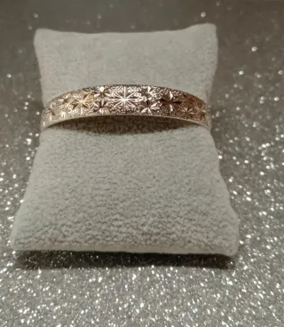 Elegante pulsera rígida con un diseño intrincado. - Acabado plateado brillante. - Patrón de estrellas o flores grabado en toda la superficie. - Estilo rígido y abierto.