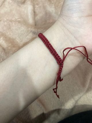 Preciosa pulsera de hilo rojo con un dije en forma de infinito decorado con brillantes dorados. Es ligera y cómoda de llevar. - Dije con forma de infinito. - Brillantes dorados. - Hilo rojo.