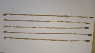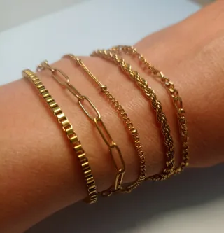 Set 5pulseras de acero inoxidable en color dorado, súper elegantes y combinables entre sí. Cada una tiene un diseño diferente, ideal para usar juntas o por separado según tu estilo del día. Perfectas para darle un toque sofisticado a cualquier look. 💫 ✔️ Material: Acero inoxidable (no se oscurecen ni pierden el color) ✔️ Color: Dorado brillante ✔️ Cantidad: 5 pulseras ✔️ Tamaño: Ajustables hasta 21 cm ✔️ Estado: Nuevas, sin uso ✔️ Incluye sobre de piel sintética para regalo 🎁