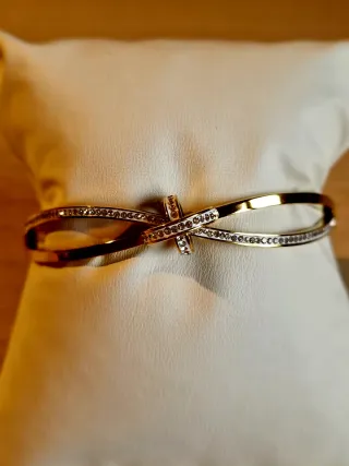 Elegante pulsera con un diseño entrelazado y adornada con pequeñas incrustaciones. - Diseño de nudo o lazo. - Detalles de pedrería brillante.