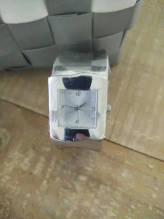 Elegante reloj de pulsera con un diseño moderno. - Esfera cuadrada. - Pulsera ancha y llamativa. - Acabado brillante.