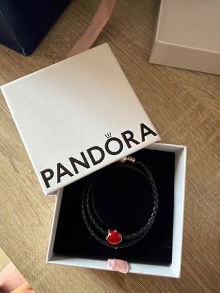Pulsera de cuero trenzado de la marca Pandora, con un charm central de color rojo. - Pulsera de cuero negro. - Charm con manzana roja.