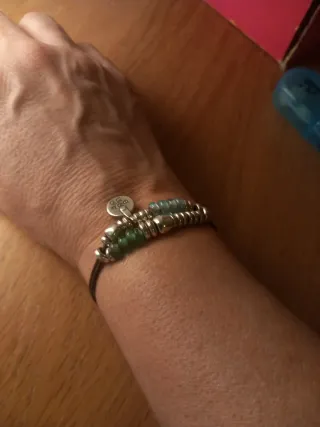 Pulsera de cuero con detalles de pepitas plateadas y cuentas de cristal en tonos verdes y azulados. Cierre ajustable. - Diseño de doble vuelta. - Cuenta con un charm circular con el logo de la marca.