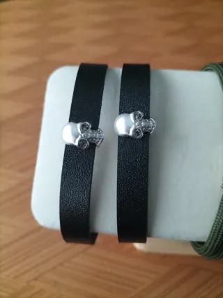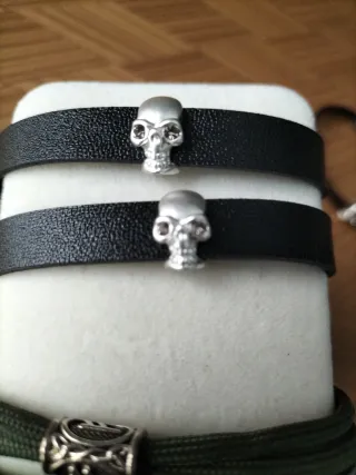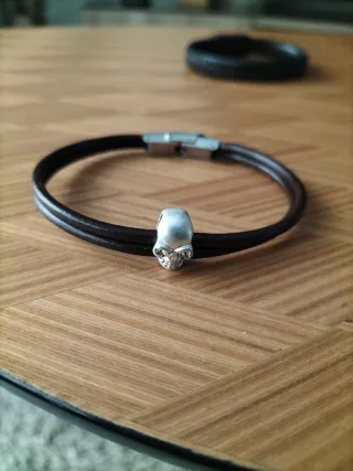 Pulsera de cuero con un detalle de calavera plateada. Un accesorio con un toque distintivo. - Material de la pulsera: cuero. - Detalle: calavera de metal plateado.