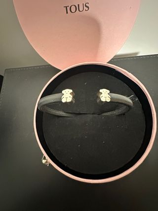Pulsera de la marca Tous con diseño de ositos. - Material: cuero y plata. - Color: negro y plateado.