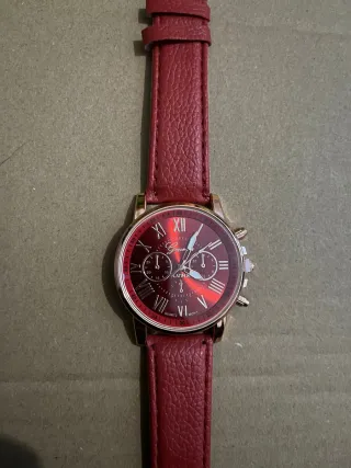 Elegante reloj de pulsera con un diseño llamativo. - Correa de cuero naranja. - Esfera con detalles dorados y números romanos. - Bisel con acabado dorado. Sin ningún uso Caja incluida