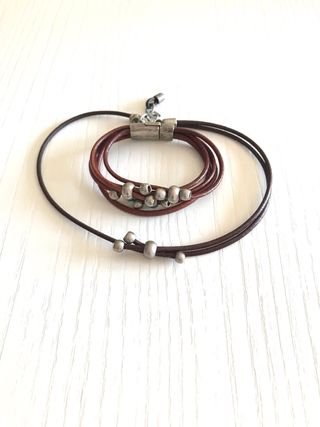 Usado muy poco. Complemento ideal para fiestas y celebraciones. El cordón es de cuero marrón y las bolitas plateadas se pueden mover para que las pongas como más te gusten (se ve en las fotos). Lo entrego con bolsa de lino de regalo. En mi perfil están los pendientes a conjunto.