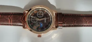 Elegante reloj de pulsera con un diseño moderno y llamativo. - Correa de cuero texturizado. - Esfera con números romanos y detalles en contraste. - Dos subesferas decorativas. Sin ningún uso Caja incluida