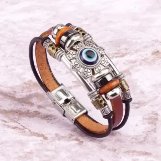 Pulsera de cuero genuino con un diseño llamativo. - Detalle central con ojo turco. - Elementos decorativos metálicos. - Cierre de acero inoxidable. ¡¡Mira en mi perfil, tengo gran variedad de artículos para regalo y bisutería. Todo nuevo a estrenar!! NO SE HACEN ENVIOS NI RESERVAS. PAGO EFECTIVO.