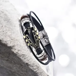 Pulsera con un diseño inspirado en la cabeza de una guitarra y notas musicales. - Material: Piel sintética. - Cierre de acero inoxidable. ¡¡Mira en mi perfil, tengo variedad de artículos para regalo y bisutería. Todo nuevo a estrenar!! NO SE HACEN ENVIOS NI RESERVAS. PAGO EFECTIVO.