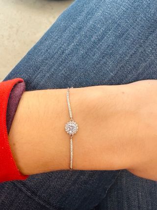 Exquisita pulsera de plata de ley que presenta una impresionante circonita blanca central (8mm) en un corte brillante, rodeada por una elegante corona de circonitas blancas más pequeñas y de alta calidad. ℹ️ Especificaciones: - Material: plata de ley 925, chapado en rodio. - Piedras: Circonitas blancas brillantes. - Longitud: 16 + 4,5 cm. - Origen: Diseñado y fabricado en España. - Certificación: Incluye Certificado de Autenticidad y el grabado del Ecomep A2 LABORATORY. - Embalaje: Entregado en una caja de lujo de cuero sintético de alta calidad y terciopelo negro.