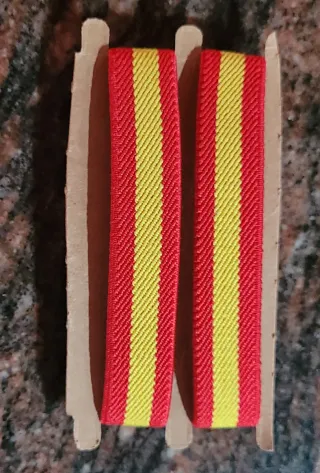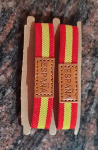 Dos pulseras elásticas con los colores de la bandera de España. Son nuevas y están en perfecto estado. - Vienen en sus respectivos envoltorios. - Diseño con una cinta de tela. - Detalle de cuero sintético con el nombre "España".
