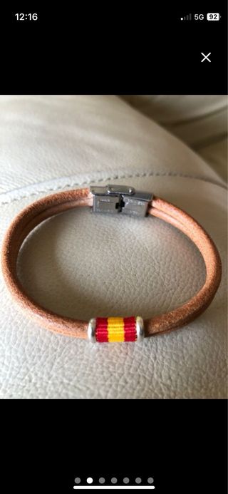 Pulsera nueva sin estrenar, hecha en cuero sintético con diseño de la bandera de España. Ideal para hombre y perfecta como detalle o regalo de Navidad. - Nueva a estrenar - Solo envios - Tamaño ajustable hasta 22 cm (se puede acortar fácilmente) - Ancho de 12 mm - Peso ligero (16 g) - Cierre resistente en acero inoxidable - Diseño elegante y moderno, ideal para cualquier ocasión - Se envía en una bolsita de regalo Envio rápido.