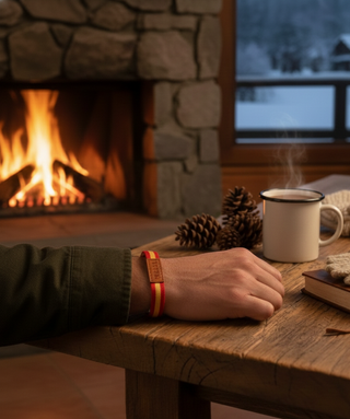 Brazalete con los colores de España. - Diseño de rayas rojas y amarillas sobre fondo azul marino. - Detalle de etiqueta de cuero con la palabra España grabada.