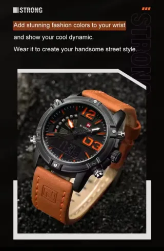Reloj de pulsera con correa de cuero. - Esfera con detalles en naranja. - Correa de cuero marrón. - Caja de metal en color negro.