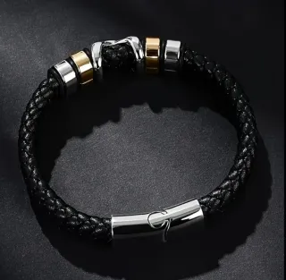 Pulsera de hombre fabricada en cuero trenzado negro, con piezas metálicas en tonos plata y dorado y cierre magnético de alta resistencia. ✔ Diseño elegante y masculino ✔ Muy cómoda y fácil de poner ✔ Ideal para uso diario o para regalo ✔ Estilo moderno y sofisticado Se entrega con caja unboxing personalizada de regalo.