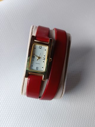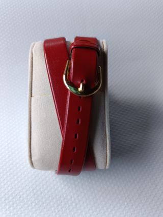Elegante reloj de pulsera para mujer. Es de color rojo y dorado. - Correa de cuero rojo, doble vuelta. - Caja rectangular dorada. - Cierre dorado de hebilla. Longitud reloj: 40 cm. La pila está gastada.