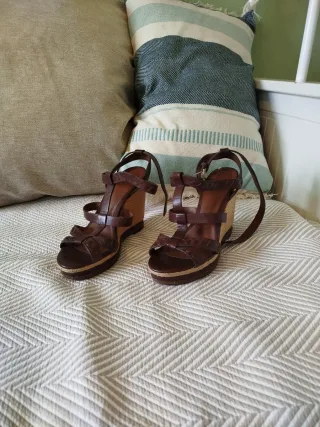 Preciosas sandalias de cuero de primera calidad, hechas a mano y cosidas con el sistema Goodyear reconocido internacionalmente como el de mayor calidad. Pespunte visto. Plantilla anatómica con la forma del pie, super cómodas. Pulsera al tobillo cruzada con hebilla y cruce en pala. Plataforma y tacón en forma de semicuña. Muy estables al ser la pala muy ancha. Suela antideslizante. Cuña de 2cm+tacón de 8,5cm en total sube 10,5cm. La horma es ancha. Comprados en New York.