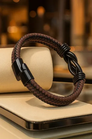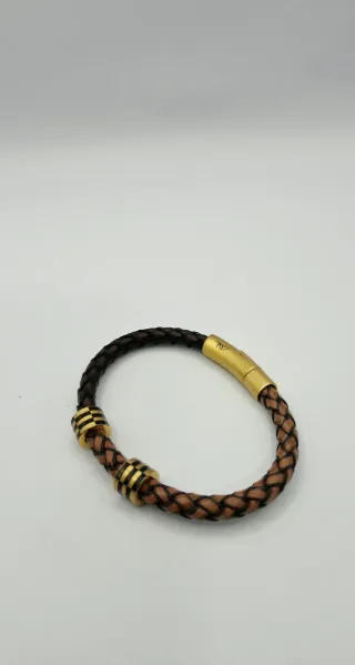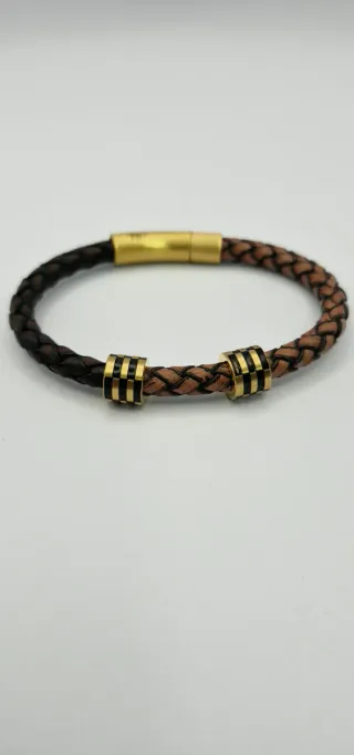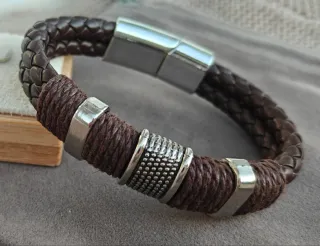 Pulsera de cuero trenzado con detalles metálicos y cierre de imán. - Diseño moderno y elegante. - Cierre de seguridad. - Materiales de calidad.