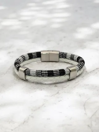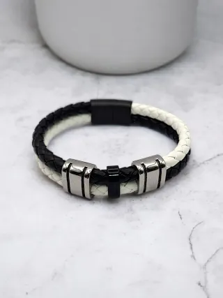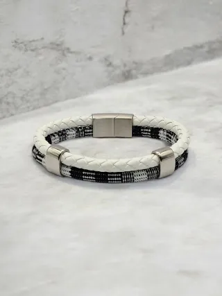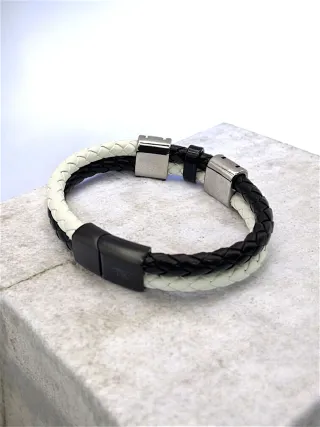 Pulsera de cuero trenzado con un diseño moderno y llamativo. - Combinación de cuero blanco y negro. - Cierre magnético de seguridad. - Detalles en acero inoxidable. - Longitud disponible 20,5 cm.