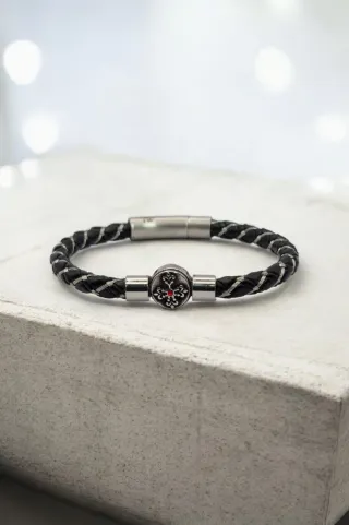 Pulsera de diseño Cruz de Lyon-cuero negro trenzado y acero inoxidable. - Diseño trenzado. - Cierre tipobayoneta. - Detalle central con piedra roja. -longitud disponible 20,5 cm.