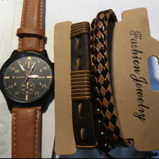 Conjunto de reloj y pulseras con un estilo moderno y casual. - Reloj con esfera negra y detalles en rosa. - Correa de cuero marrón. - Incluye cuatro pulseras: dos de cuero trenzado y dos de cuentas de madera. - Las cajas no están incluidas.