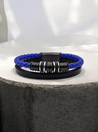 Pulsera de cuero con un diseño moderno y llamativo. - Trenzado en color azul. - Tira lisa en color negro. - Detalles metálicos. - Cierre de seguridad. - Longitud disponible 20,5 cm.